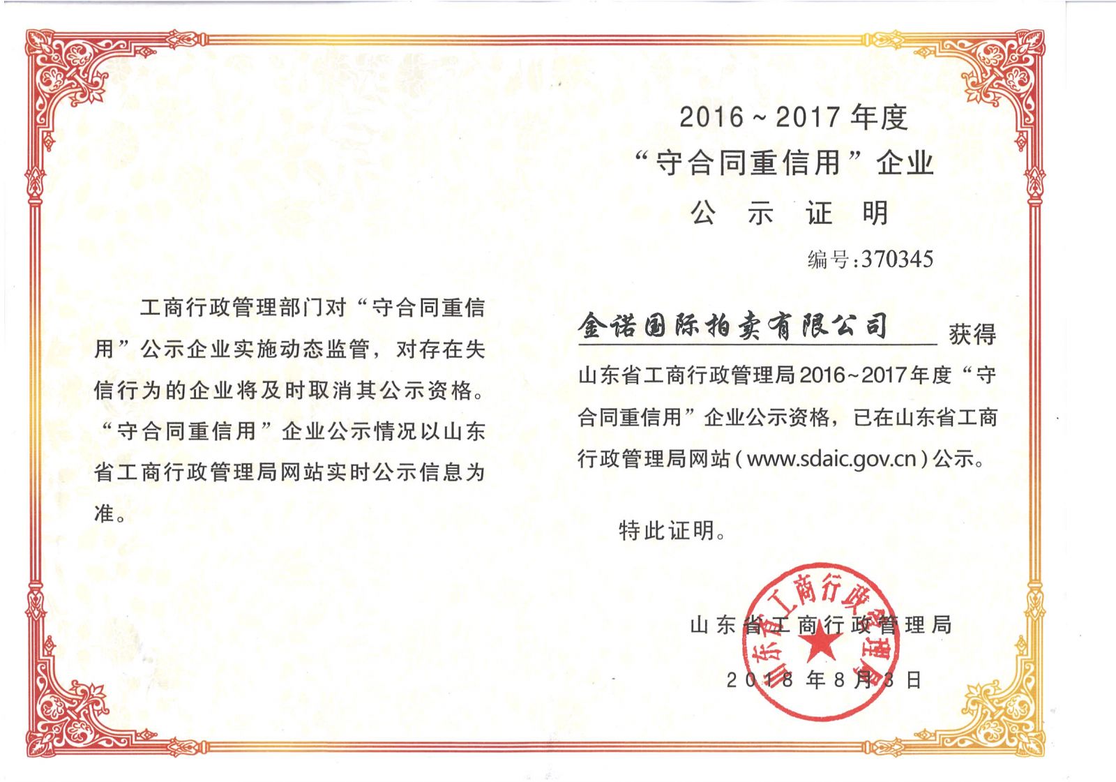 2018年10月26日,全省企業(yè)誠(chéng)信示范工作會(huì)議在泰安隆重召開(kāi)。來(lái)自省政協(xié)有關(guān)領(lǐng)導(dǎo)、省直有關(guān)單位領(lǐng)導(dǎo)、省誠(chéng)促會(huì)領(lǐng)導(dǎo)、全省第六批誠(chéng)信建設(shè)示范企業(yè)主要領(lǐng)導(dǎo)及誠(chéng)信建設(shè)示范企業(yè)領(lǐng)軍人物、新聞媒體等150余人齊聚一堂,共謀盛會(huì)。金諾國(guó)際拍賣(mài)榮獲山東省“誠(chéng)信建設(shè)示范單位”榮譽(yù)稱號(hào)、董事長(zhǎng)商雪梅被授予“誠(chéng)信建設(shè)示范企業(yè)領(lǐng)軍人物”稱號(hào)。